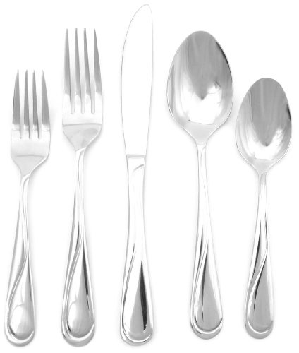 This classic stainless steel flatware set from the Hampton Silversmiths collection by Hampton Forge is perfect for any occasion. Featuring a swirled line design with a sleek, mirror finish, this set never needs polishing, making it convenient for everyday dining. The set contains four of each utensil, with salad forks, dinner forks, dinner knives, dinner spoons, and tea spoons; everything you ne